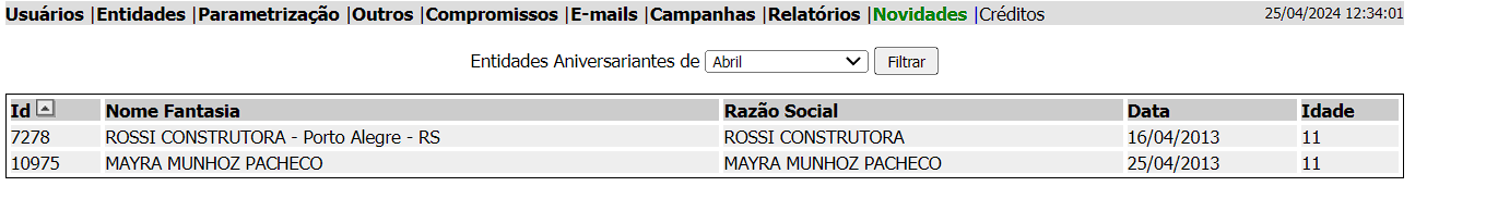 Nessa tela você consegue visualizar os aniversários das entidades cadastradas, filtrando pelo mês.