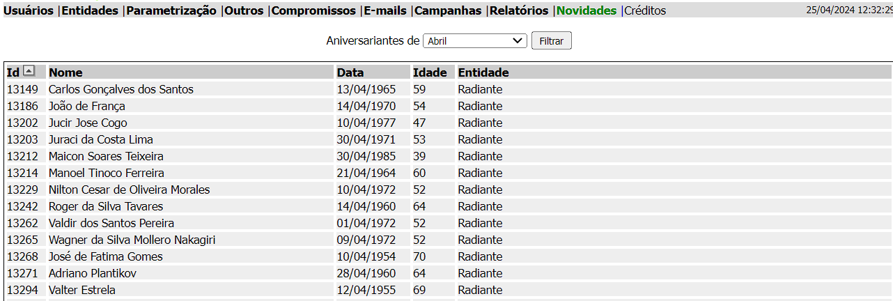 Nessa tela você consegue visualizar os aniversários dos contatos cadastrados, filtrando pelo mês.
