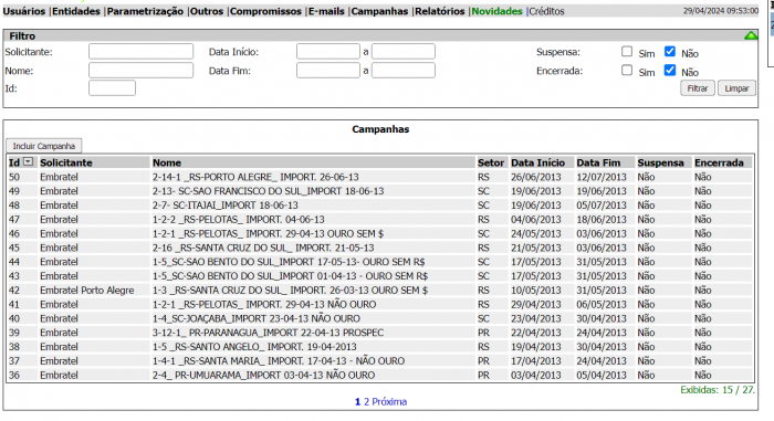 Nesa tela você pode pesquisar campanhas pela sessão de filtros, incluir campanhas e visualizar campanhas pela lista de campanhas.