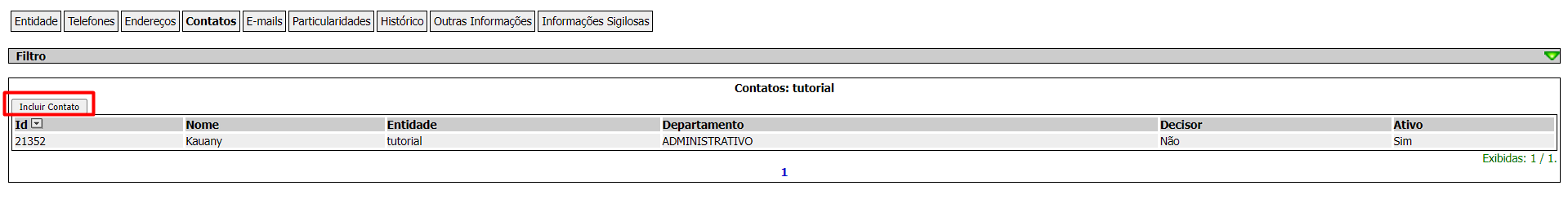 Na tela de entidades, você pode filtrar as entidades, ver as entidades existentes ou incluir uma entidade.