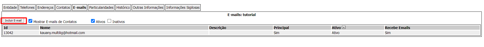 Nesta seção você consegue visualizar e inserir emails relacionados a entidade