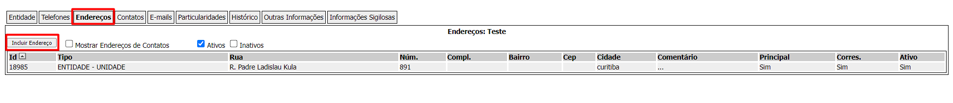 Nesta seção você consegue visualizar e inserir endereços relacionados a entidade
