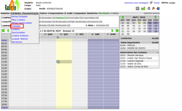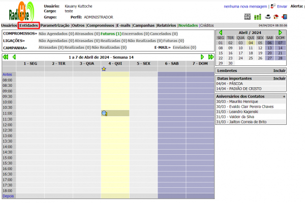 Nesta tela você consegue criar e acessar entidades. Essa tela serve para acessar informações das entidades (como email e contatos), anotar informações relevantes sobre a entidade, e outras ações.