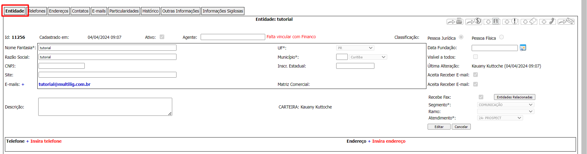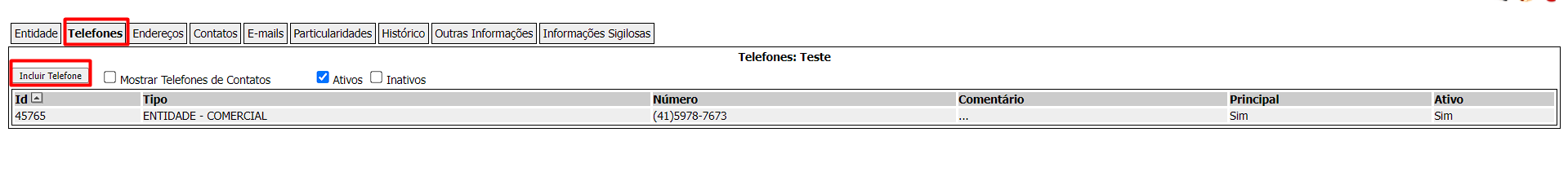 Nesta seção você consegue visualizar e inserir telefones relacionados a entidade