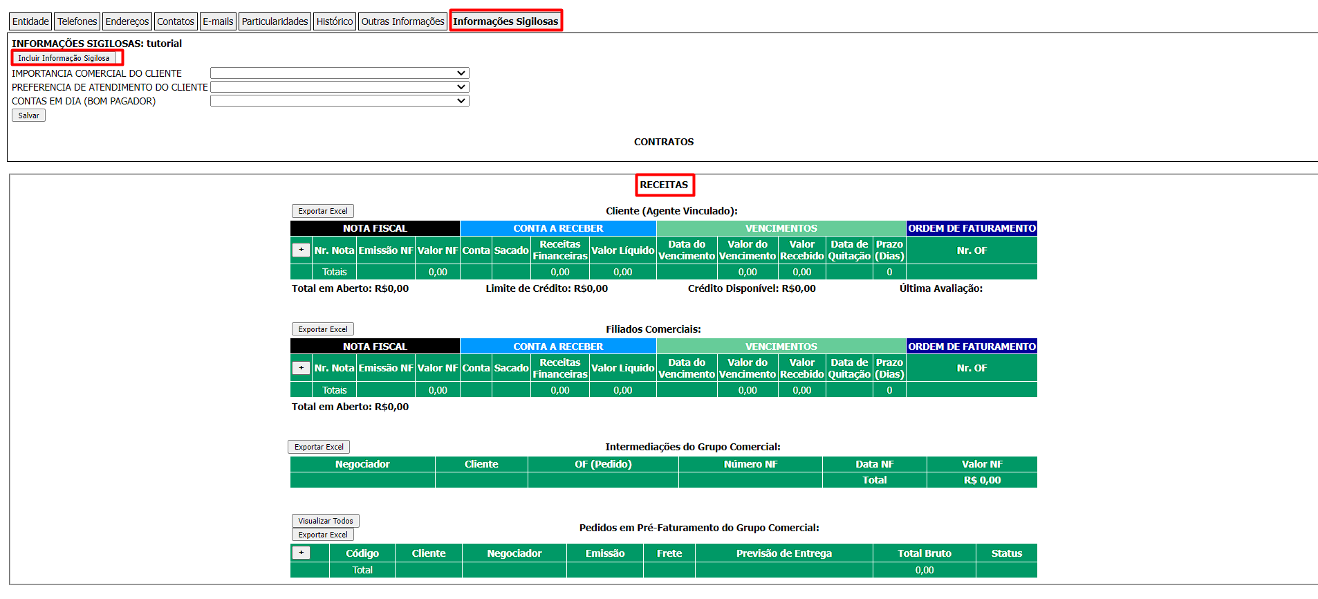 Nesta seção você consegue visualizar informações sigilosas, ou seja, receitas financeiras e informações sobre a entidade (se é um bom pagador, como deve ser o atendimento, qual a importância dele) .