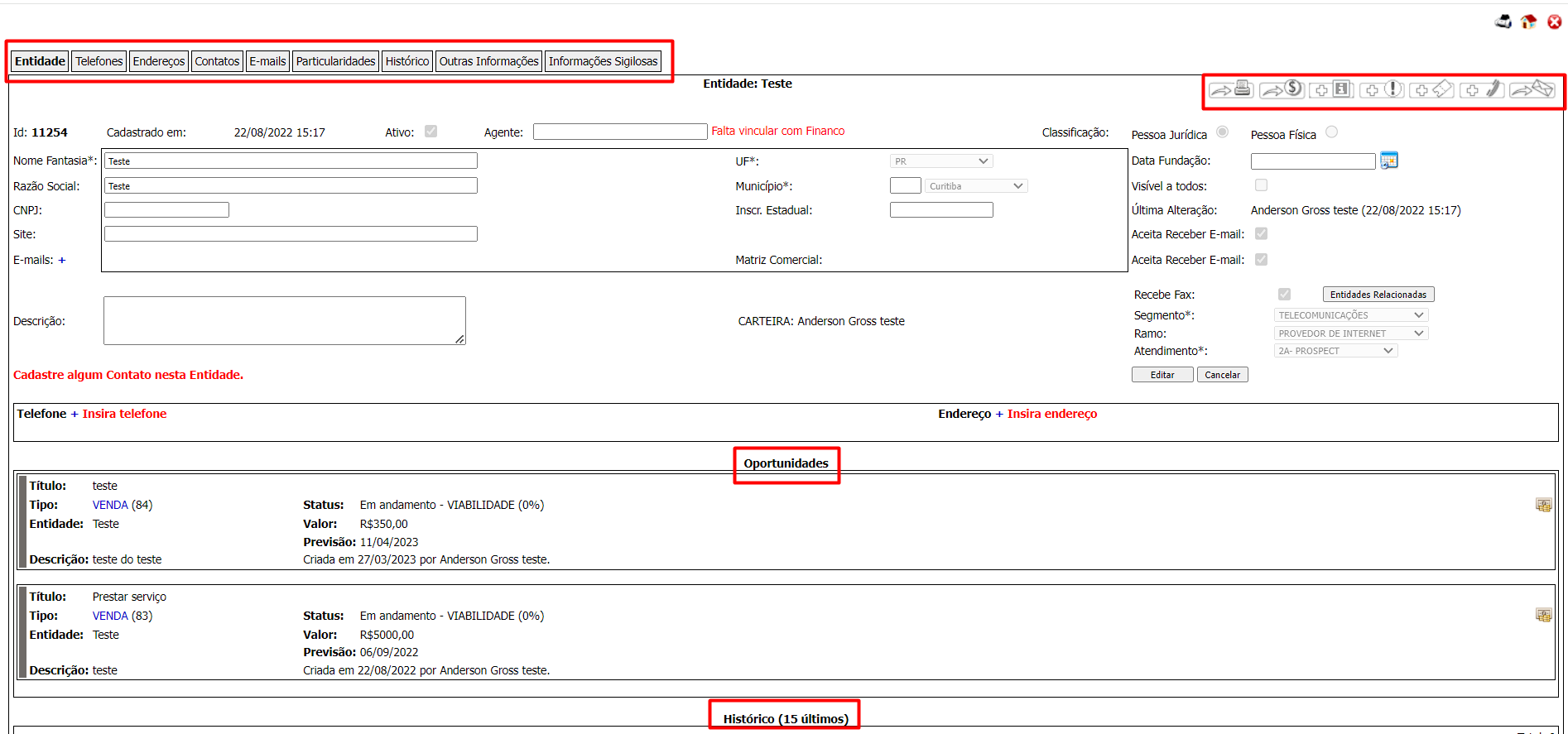 Nesta seção você consegue verificar as informações principais da entidade e também editar as informações presentes nela. Você também pode ver as oportunidades abertas para essa entidade e um histórico de ações e informações.