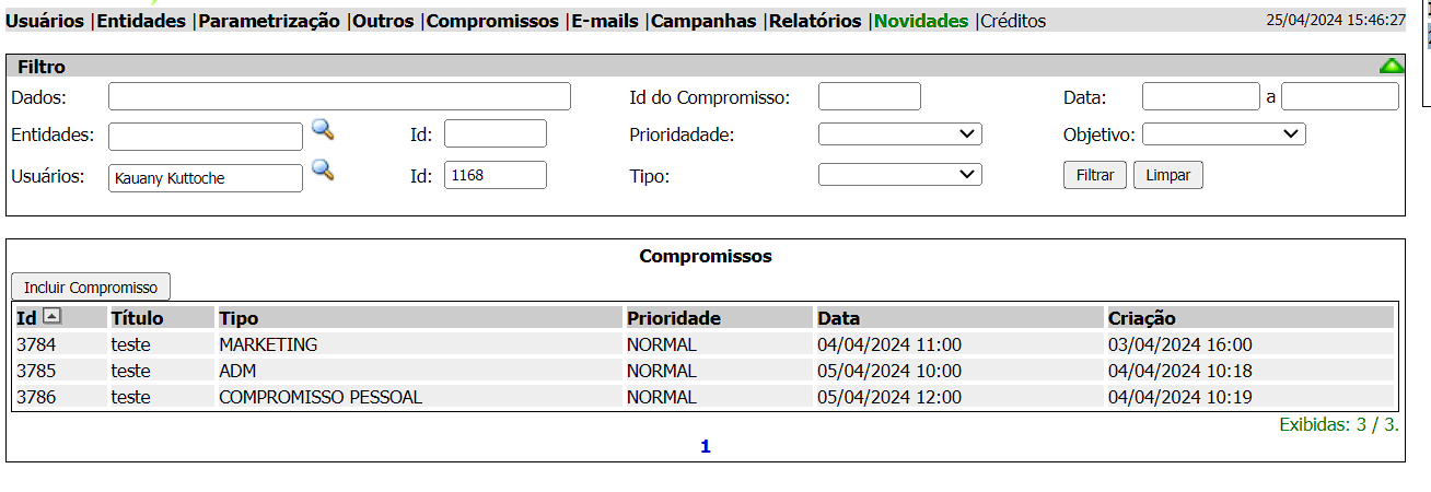 Nesta tela você consegue visualizar os compromissos em formato de lista e também pesquisar compromissos pela seção de filtros.