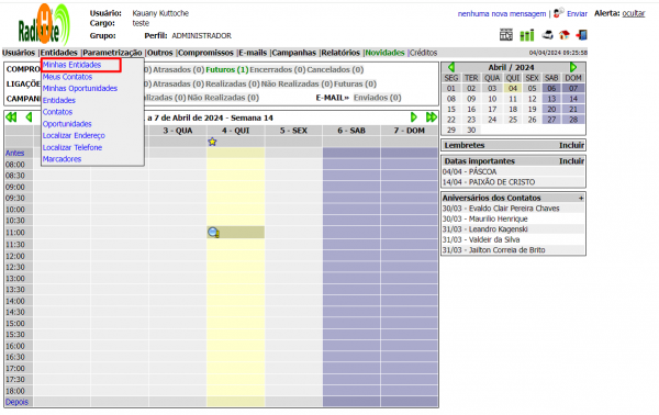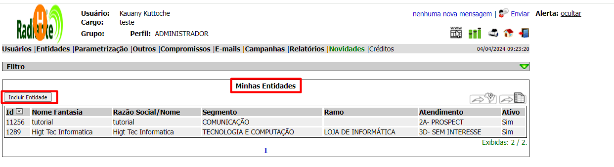 Na tela de minhas entidades, você pode visualizar e acessar suas entidades e também adicionar uma nova entidade.