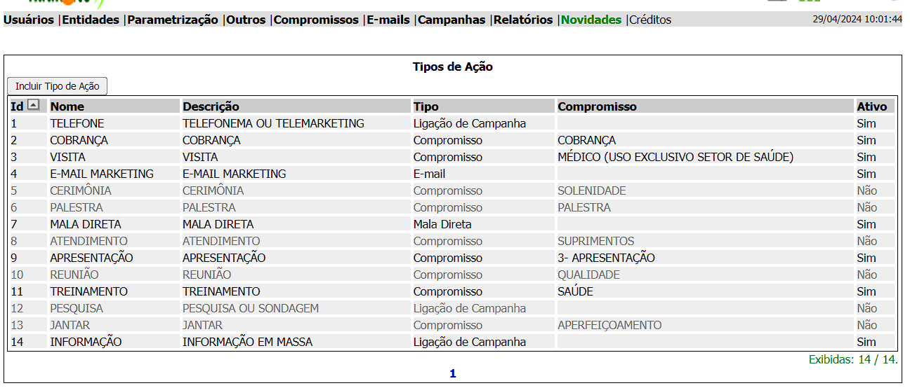 Nessa tela você pode visualizar ou incluir um tipo de ação que pode ser adicionado como informação/descrição na campanha.