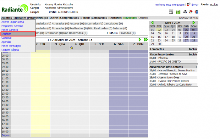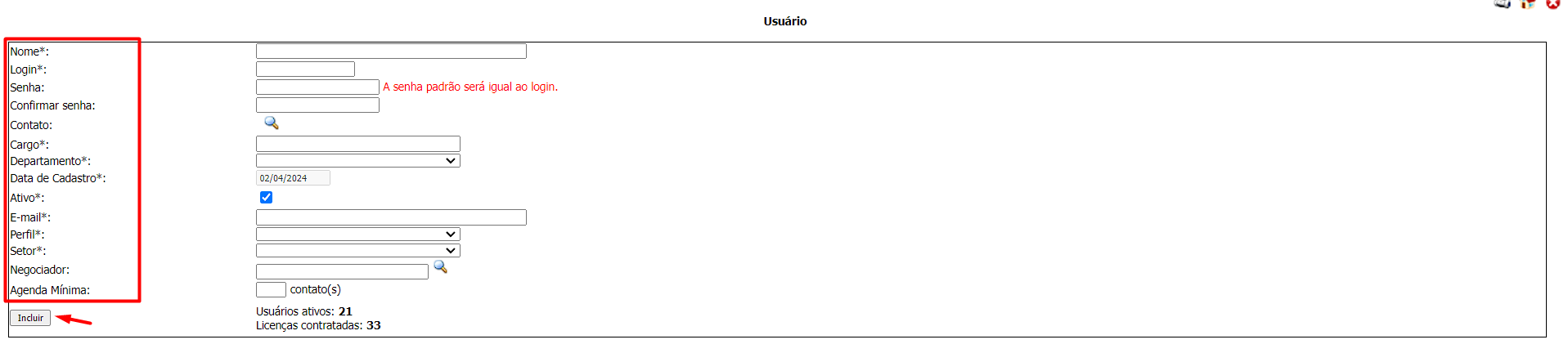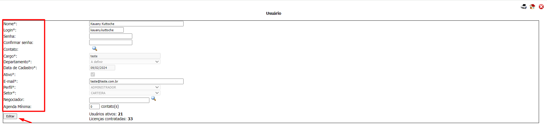 Na tela de usuários você pode inserir um novo usuário ou editar as informações de um já existente.